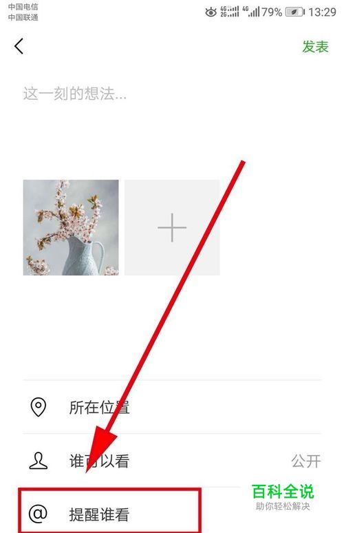点击确定后,可以“提醒谁看”后面看到提醒好友的头像。点击发表。将该消息发布到朋友圈。