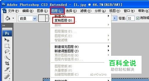 用Photoshop打开图片,在菜单【图层】中选择【复制图层】命令,复制“背景”图层。