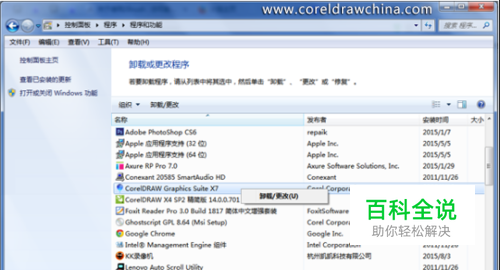 在“控制面板”中选择“程序”>“程序和功能”,在弹出的窗口中选择CorelDRAW Graphics Suite X7 (64-Bit),用鼠标右键单击,在弹出的快捷菜单中选择“卸载/更改”命令,如图所示。