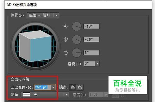 然后选中矩形,点击效果——3D——凸出和斜角,注意这里红框部分是突出厚度,也就是包装盒的宽度。之前设置的矩形长宽其实是立体模块的长和高。由于这里单位是pt,1mm≈2.83pt,所以乘以89就是252.然后下面预览勾选一下,如果对厚度不满意,也可以直接拉动凸出那里的拉杆进行调整,然后点击确定。