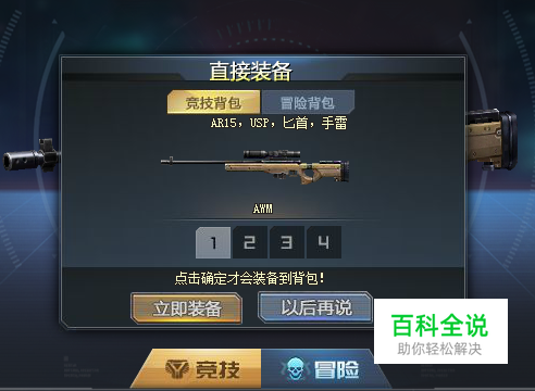 装备背包: 武器购买好了之后,记得要装备哦,如果它还是安安静静的躺在仓库里,我们也用不了,记得装备到1号背包里,我们就可以在实战里进行使用了。