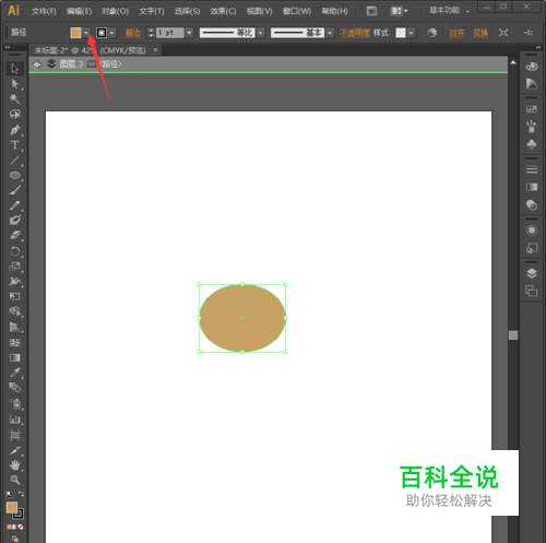 再用椭圆工具画一个正圆,将制作的月牙形图案拖入圆形,做成如图所示,也就是卡特耳朵形状,然后点击月牙形状图案,再点击箭头所指处选择第一个斜杠,取消描边。