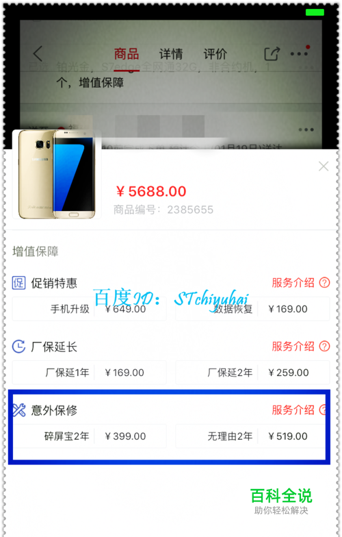 在京东APP中,找到三星的店铺,点击进入店铺,选择自己要的型号手机,在购买的时候会有详细的购买界面。在购买界面中,找到“保障服务”,点击进入这个界面。