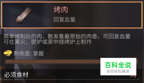 烤肉 必备食材:肉 基础属性:回复血量 美味属性:小幅提升对野生动物的伤害 耗时:00:05 简单烤制后的肉,散发着最原始的肉香,可回复血量;可在篝火、壁炉或家中烧烤炉中制作。