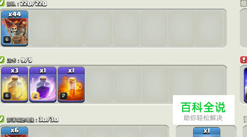 第一、先看一下,用的是9本兵种,44个黑气球,1个狂暴,3个治疗,加上双王加一个急速。