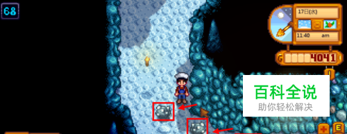 关于蟹笼的制作,最复杂的是铁条(有些版本叫铁锭): 方法1 在矿区挖矿40层往下,80层往上铁矿石特别多,如下图所示的石头100%出铁矿。