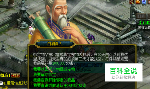 到达之后,点击白眉真人,即可出现一个解绑装备或者解绑宠物,每次解绑的费用为10万,代金券以及金钱都可以。