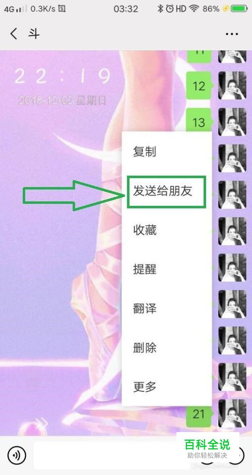 然后我们需要按住我们想要转发的聊天记录,这时就会弹出下拉的子菜单,在子菜单中可以找到“发送给朋友”。