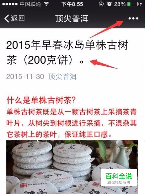 首先我们 打开手机微信软件,找到我们需要保存的文章,下面以《2015年早春冰岛单株古树茶(200克饼)》这篇文章为例子,把它从微信里将文字及图片都复制出来,我们点到右上角有个分享【...】;