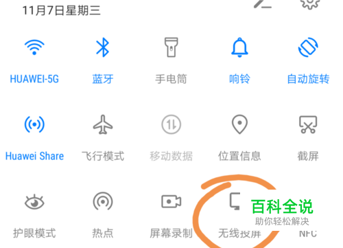 首先从屏幕顶端下拉,打开快捷菜单,选择“无线投屏”
