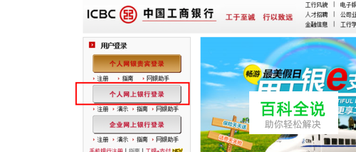 这里我以中国工商银行网银登录密码忘记为例向大家讲解,首先,点击中国工商银行官网,这里点击个人网上银行登录。