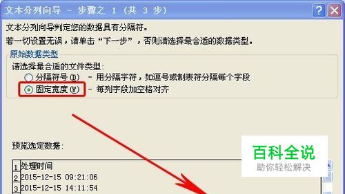 在弹出分列向导对话框第一步中,选中“固定宽度”分列模式(部份列数据如果是有特定符号,如空格、减号、句号之类的,也可以用“分隔符号”分列模式,方法类似)。点击“下一步”,如图示: