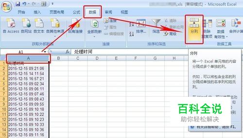 打开需要数据分列的EXCEL表,选中需要分的列,如下以A列为例,选中“A列”,点击菜单“数据”-“分列”,如图示: