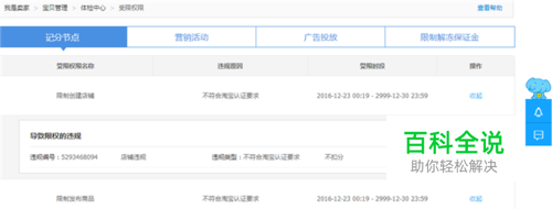 点开详情查看是店铺违规,但是不扣分,且封禁日期到2999年,这说明并没有违规发布宝贝。