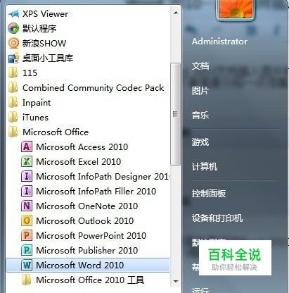 首先要启动Word 2010程序,可在开始菜单中的Microsoft Office文件夹单击Word 2010程序。