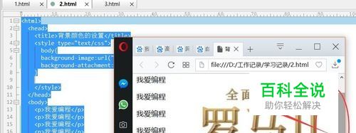 如果有滚动条的时候我们该如何让图片随着我们滚动条的移动而移动呢?其实默认的就是随着滚动条移动背景图片也移动了。这里用CSS也可以实现使用的 background-attachment:scroll;来实现的。 <html> <head> <title>背景颜色的设置</title> <style type="text/css"> body{ background-image:url("1.jpg"); background-attachment:scroll; } </style> </head> <body> <p>我爱编程</p> <p>我爱编程</p> <p>我爱编程</p> <p>我爱编程</p> <p>我爱编程</p> <p>我爱编程</p> <p>我爱编程</p> <p>我爱编程</p> <p>我爱编程</p> </body> 可以看到网页的背景随着我们的滚动条移动而做相应的移动。
