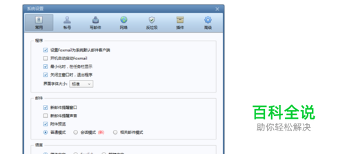 1.打开fomail--账号管理--常用栏可以设置Foxmail为系统默认邮件客户端,开机自动启动foxmail等一些常见信息。
