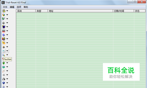 首先,下载好Trial Reset 注册表清理工具并启动。在整个界面中,我们找到Flexnet,然后点击旁边的剪头,接着点击扫描,等待扫描完成。
