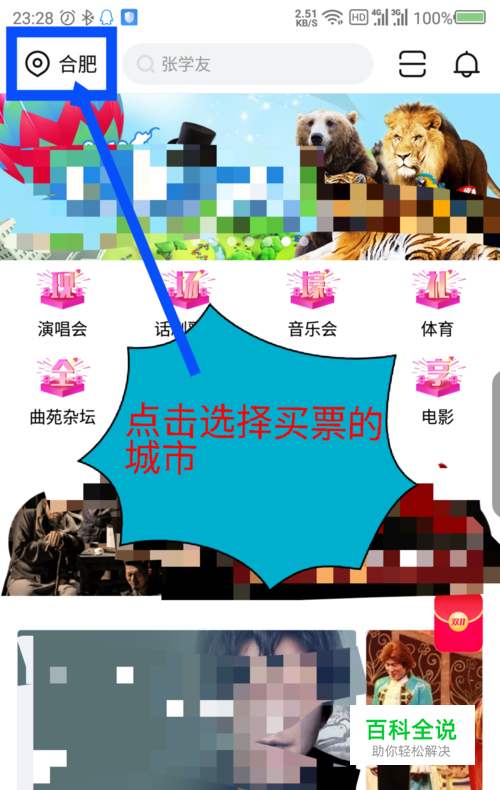 在大麦软件的首页界面,点击左上角的位置信息,选择要买票的的城市。如图所示
