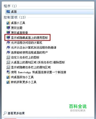 在出现的菜单下面有个“搜索文件或程序”的框,这个是运行框,我们在框内输入“桌面”两个字(不加引号),就会出现下图,在出来的项目中找到“显示或隐藏桌面上的通用图标”,并点击