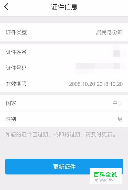 可以看到咱们的身份证信息,我的证件到今年十月份就到期了,所以如果办理了新身份证就可以在这点击更新证件,如下图所示。