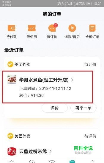 第一步在我们的手机中打开美团,进去之后点击底部的订单,选择要投诉的客服订单进去,如下图所示: