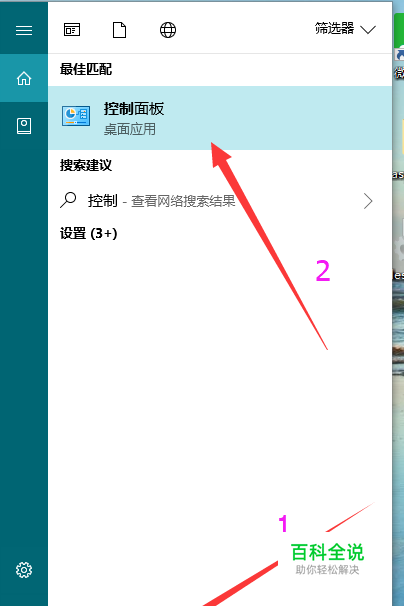 点击左下角的搜索框,在其中输入 控制面板,在搜索的结果中点击 控制面板,打开。