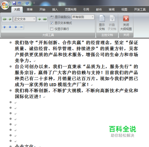打开已经编辑好的文档,选择视图>大纲视图会出现如下界面: