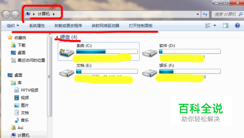 在计算机页面中,我们可以看到该页面上方有诸多的功能选项,比如系统属性、卸载或更改程序、打开控制面板等等,在中间区域,我们可以看到硬盘分区,有四个硬盘区域等;