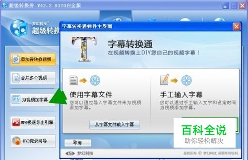 为视频加载SRT字幕文件或手工输入字幕 添加类似电影、电视剧的旁白字幕,字幕转换通提供了两种方案。一种是载入SRT字幕文件,直接为视频添加字幕。该功能适合网上下载的没有字幕的电影文件,为视频添加内嵌字幕。还有一种是为视频手工添加字幕。为自己拍摄的视频或下载的视频,手动输入字幕说明的。你只需点击“从字幕文件载入字幕”按钮以及“为视频手动添加字幕”按钮即可实现这两种给视频加字幕的功能。