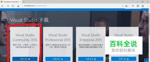 首先我们进入微软官网,进入Visual Studio2015下载页面,在图2中选择第一项Visual Studio Community2015免费下载,下载后会得到一个引导安装文件,这个安装包一般很小。