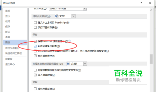 六、在“高级”选项卡的右侧窗格中,找到“保存”区域中的“始终创建备份副本”选项并将其勾选上即可。如图所示;