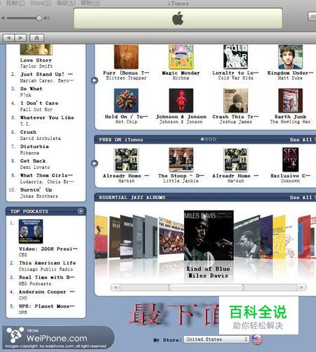 还是要耐心,稍微等下,最上面的进度条在自动跑,等它更新完,就完全打开了!进去后看见一个全英文的界面,还有很多歌曲下载啊什么的,不管它!将页面滚动条(这个各位不需要我解释是什么了把?)拉到最下方。看见 My Store [所在国家] ,这里要说下,如果是新更新的ITUNES基本都是默认 China ,但是国内的ITUNES资源不丰富,建议各位改成 United States(美国),公认的资源最丰富的ITUNES网店,方法很简单,国家英文名字旁边的小箭头点一下,出来个选择框框,美国在第一个!下图最下面的框子里!