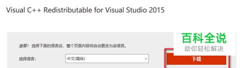 进入微软官网下载Visual C++ Redistributable for Visual Studio 2015。点击“下载”