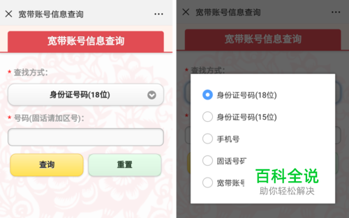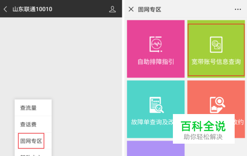 方式二:关注并绑定“山东联通网络专家”微信后,点击“固网专区”>“业务查询”>“账号信息”;进入“宽带账号信息查询”页面,选择地市、查询方式等信息,进行查询。