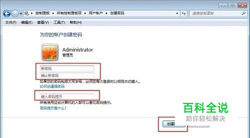 点击开始—控制面板—用户帐户—为您的账户创建密码,为管理员账户Administrator创建一个密码,点击确定即可。