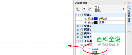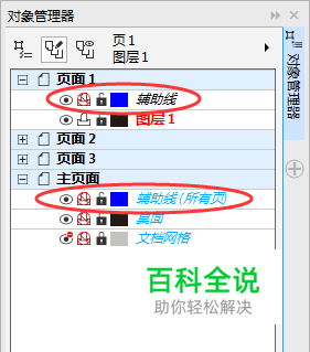 所有页显示辅助线 点击菜单栏“窗口>泊坞窗>对象管理器”命令。软件界面的右侧即可看到图层面板,默认状态下,每个新建的文件都是由页面1和主页面构成。其中,在页面1中包含“辅助线”;在主页面中也包含“辅助线(所有页)”,其实这两个辅助线的用法是不同的。