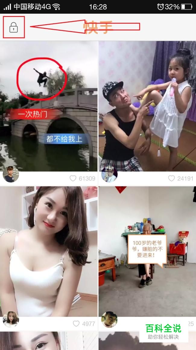 打开快手,在界面中我们可以看到很多视频,点击界面左上角的图标。