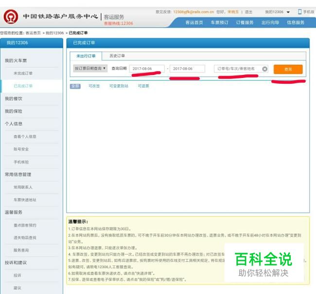 然后进入以下页面,如图,选择查询日期或者车次、订单号、姓名,然后点击右侧“查询”