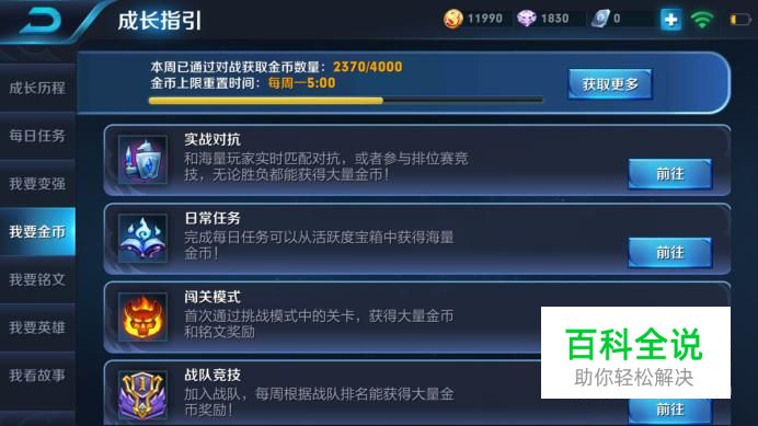 在成长指引中我们可以看到我们一周对战的话是可以最多4000金币,然后目前我这周是获得了2370个金币,还没达到上限。因此想要刷金币的玩家,可以时常关注自己本周通过对战得到的金币是否达到上限值,如果已经达到4000,那就需要通过其他途径来获得金币。