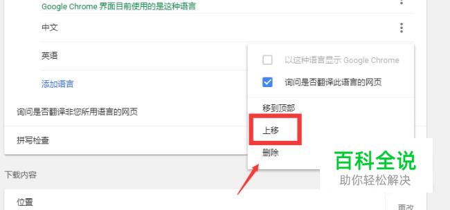 点击英语后面的设置按钮,点击上移选项。将英语往上移动。