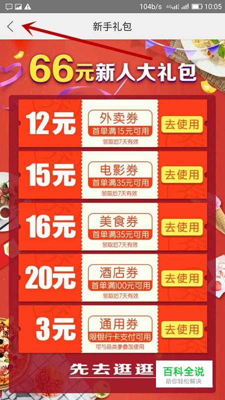 新用户先下载美团APP,下载完成后,点击图标;一开始进入美团APP,系统会自动跳出图1的界面(意味着你作为新用户,有那么多的抵用券可以用);点击图1页面顶部左端的箭头标志,就会进入美团的首页面;
