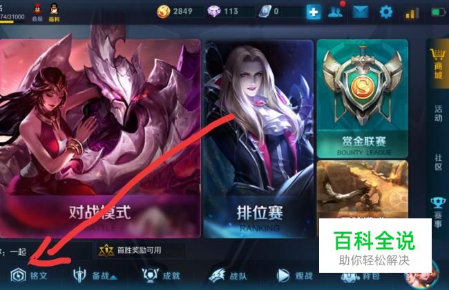 进入到游戏界面,新手可能会不知道铭文在什么地方,这里先在主界面的下方找到铭文字样的按钮,点击进入,如图。