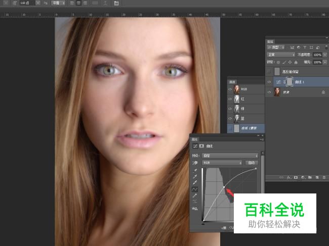 建立一个曲线调整层,然后将曲线向高处拖拽。这样脸上的痘痘瞬间就消失啦,不过因为我们只需要调整脸部。