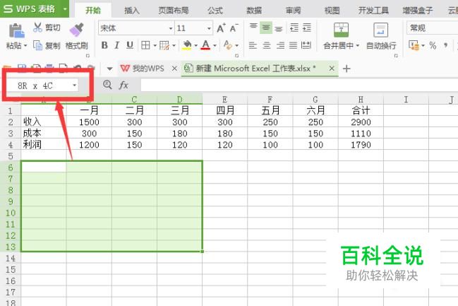 然后选中这个需要转置的区域,接着就是看表格的左上角有一个4R*8C的字样的,这个就是表示的是4行和8列的需要转置的区域,所以R表示的是行,C表示的就是列了,如图所示