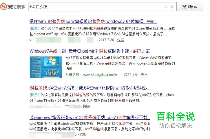 打开搜狗搜索,输入关键字64位系统下载。点击确认后查看搜索结果。