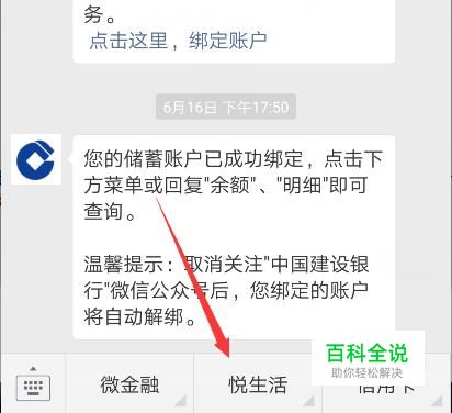 首先微信关注“中国建设银行”公众号,这关注后打开对话框,点击下方的“悦生活”。