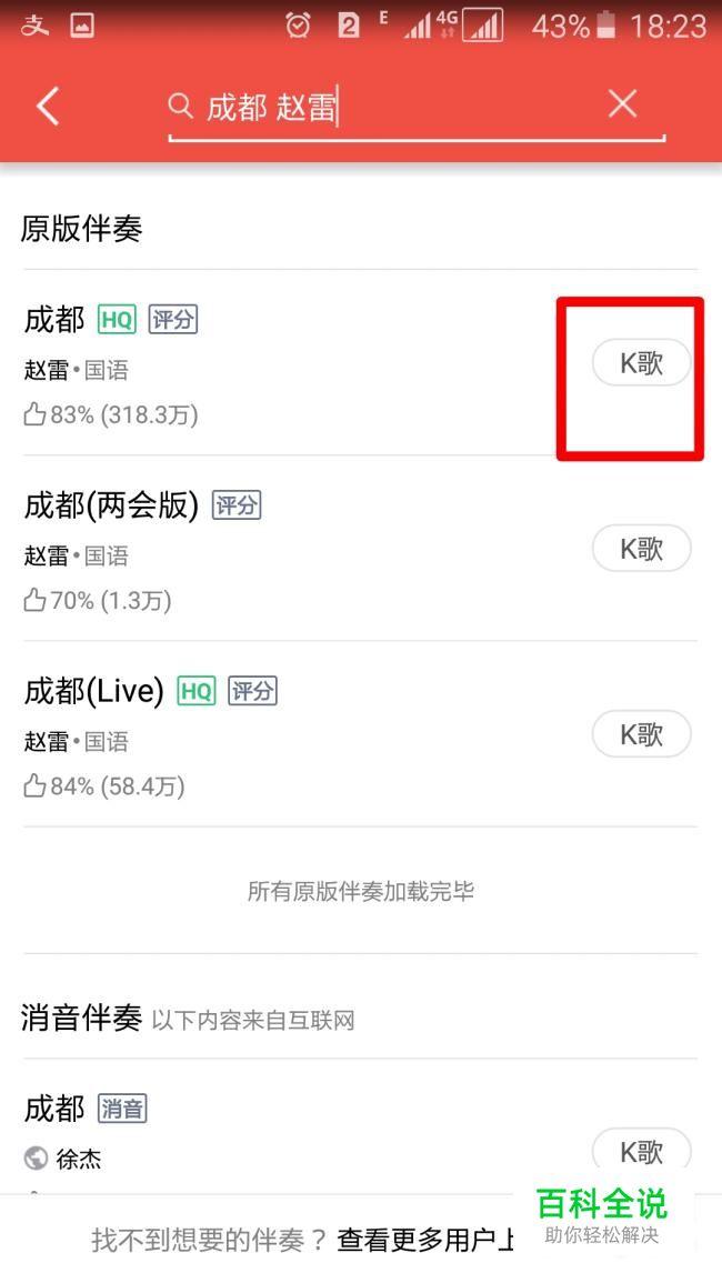 搜索到自己想要的歌曲后,点击歌曲旁边的k歌选项。