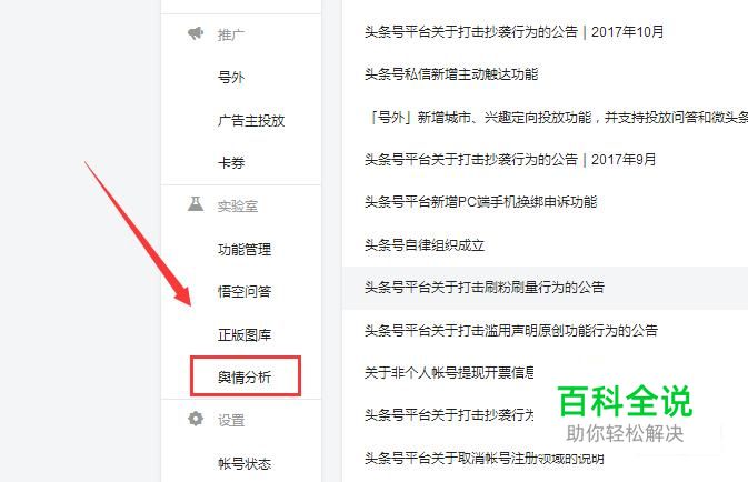 打开并登陆今日头条页面,在左侧找到并点击“舆情分析”选项卡,进入另一个页面内。