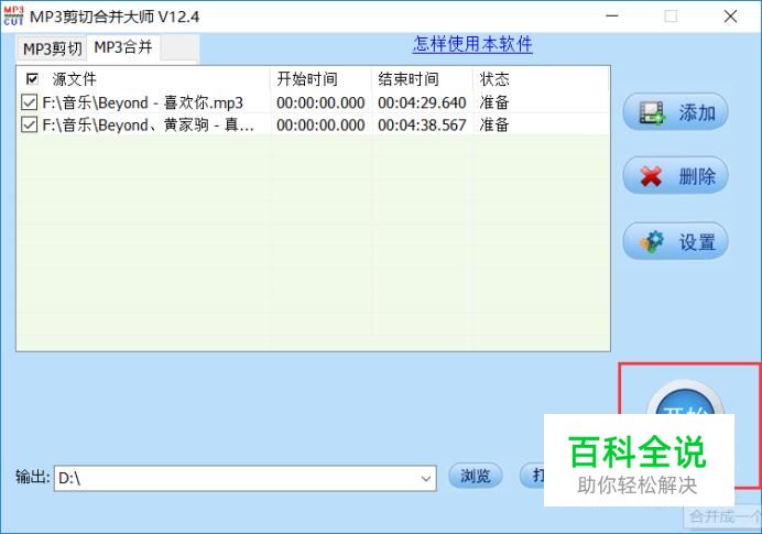 歌曲文件选择完毕之后,点击软件主界面上的“开始”按钮即可开始歌曲文件的合并操作。